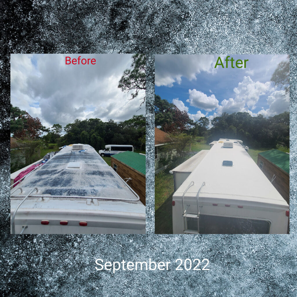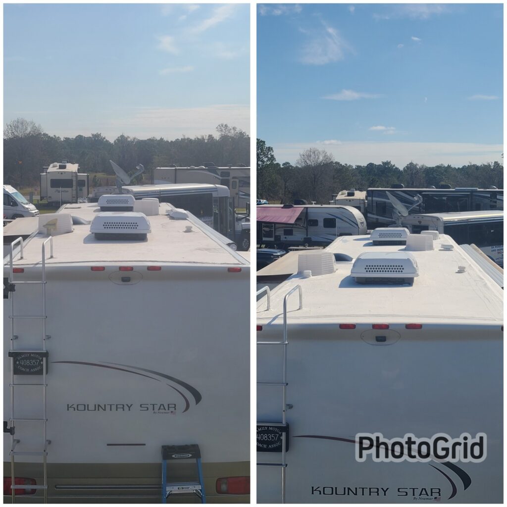 The entire process can take as little as 2-3 days (in good weather) but every RV Roofing Solutions complete roofing system comes with a 10-year no leak guarantee! There are stain blockers and UV blockers built into the product that will not only protect the RV from the sun’s harmful rays but also keep the RV noticeably cooler on hot days. Once complete, An RV Roofing Solutions complete system will be %100 maintenance free. There is no need to caulk the roof seams, vents, antenna, or skylights again. Preventative maintenance, like our system, is the best way to protect your RV. The only thing you will need to do is wash the RV twice a year!